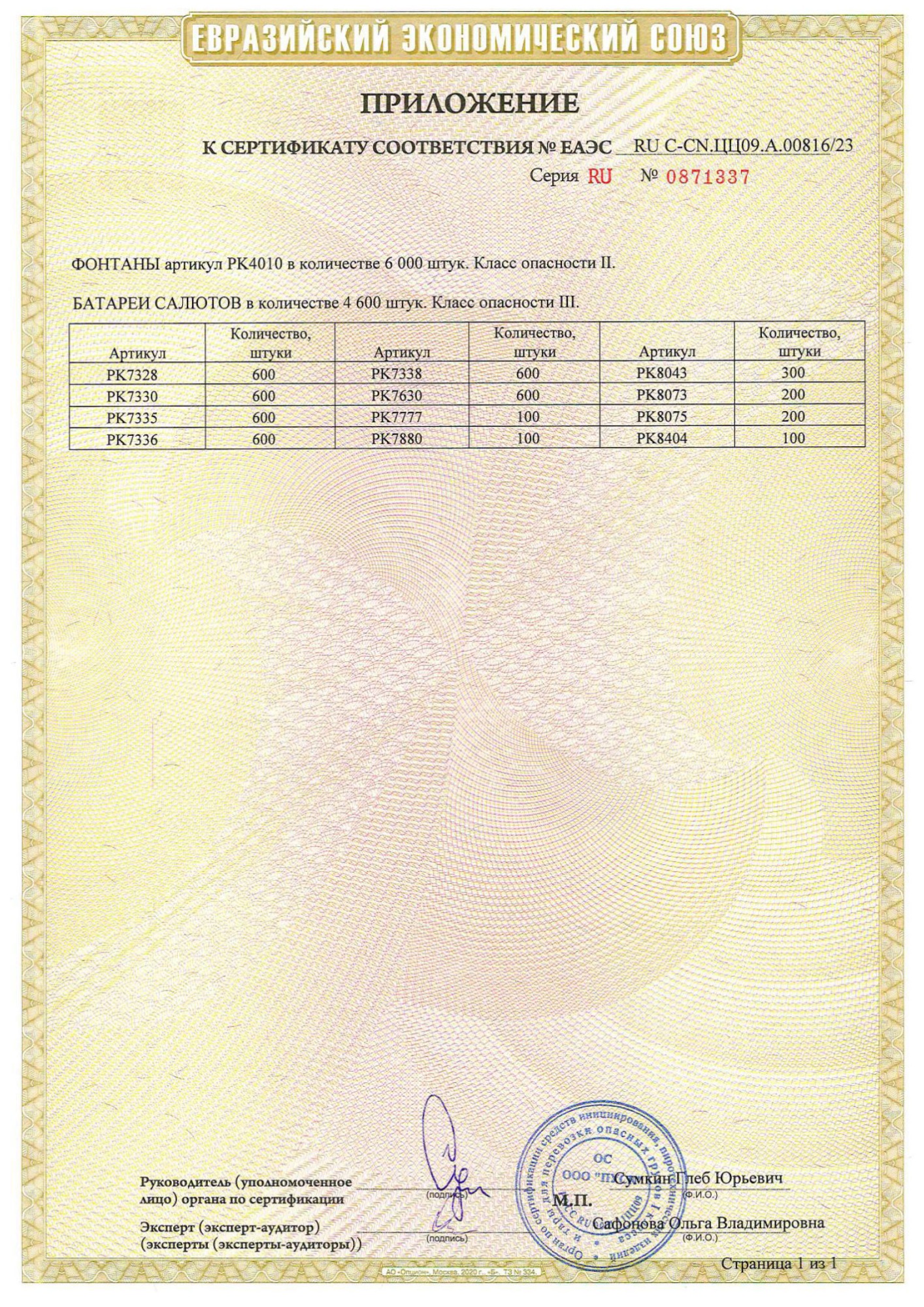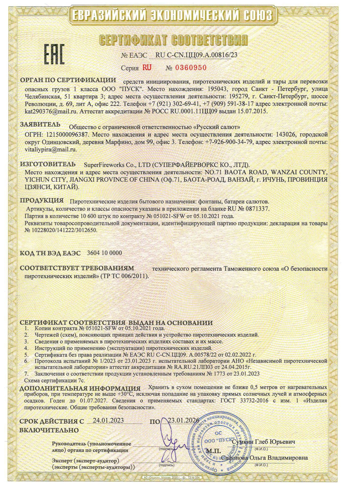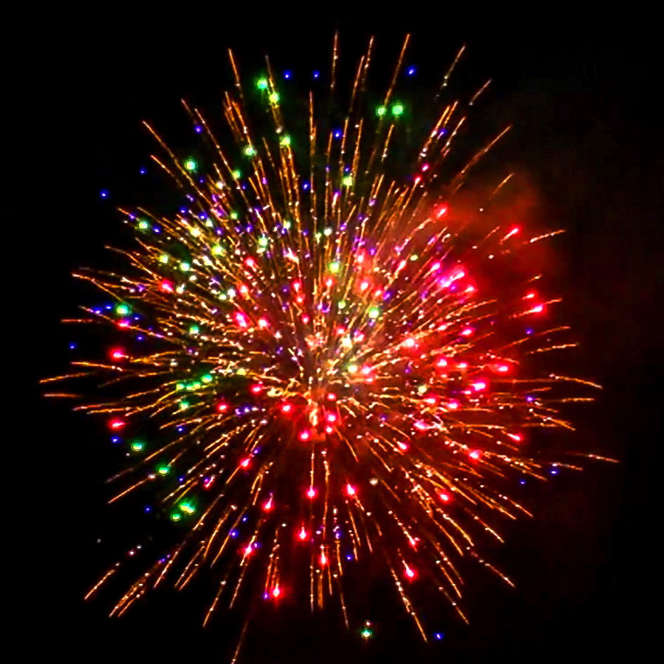 Красный жемчуг в трещащем облаке, меняет белая корона с крупным, зеленым жемчугом. Залпы красных, хвостатых хризантем с мерцающим, розовым бисером и белым стробоскопом, меняет трещащая, тигровая пальма. Финальный залп из трещащих, тигровых пальм.